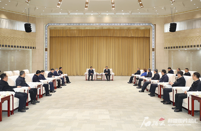 11月24日,自治区党委书记、兵团党委第一书记、第一政委马兴瑞,自治区党委副书记、自治区主席艾尔肯·吐尼亚孜在乌鲁木齐与青海省委书记、省人大常委会主任陈刚一行举行工作会谈。石榴云/新疆日报记者 邹懿摄