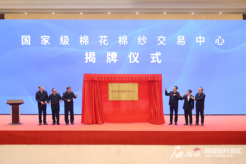 天山网-新疆日报讯(记者王兴瑞报道)12月18日,由自治区人民政府、新疆生产建设兵团和中华全国供销合作总社共同设立的国家级棉花棉纱交易中心在新疆国际会展中心揭牌成立。自治区党委书记、兵团党委第一书记、第一政委马兴瑞出席揭牌仪式并为交易中心揭牌。中华全国供销合作总社党组书记、理事会副主任韩立平,自治区党委副书记、自治区主席艾尔肯·吐尼亚孜致辞并揭牌。