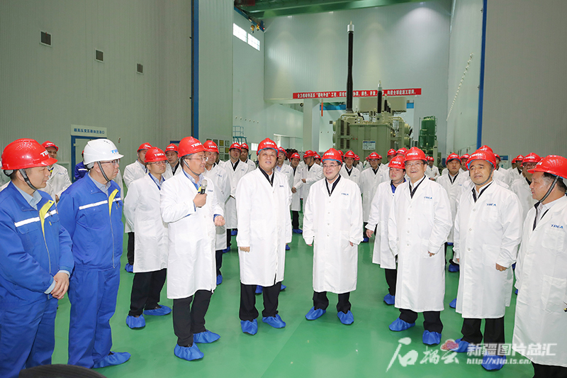 3月20日,自治区党委书记、兵团党委第一书记、第一政委马兴瑞,甘肃省委书记、省人大常委会主任胡昌升,甘肃省委副书记、省长任振鹤,自治区党委副书记、自治区主席艾尔肯·吐尼亚孜,在位于昌吉市的特变电工新疆输变电科技产业园,考察高新技术产业发展、科技创新工作。石榴云/新疆日报记者 崔志坚 摄