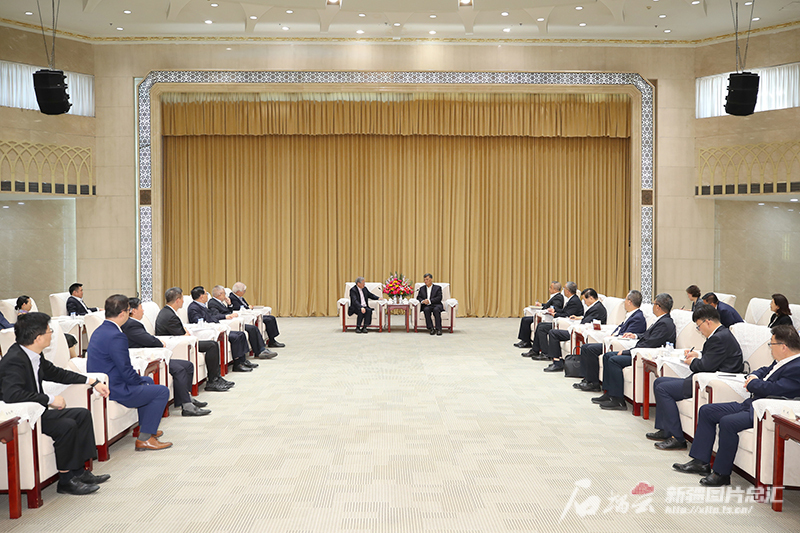 5月13日,自治区党委书记马兴瑞、自治区主席艾尔肯·吐尼亚孜在乌鲁木齐会见来疆考察访问的美国国际华人科技工商协会代表团一行。石榴云/新疆日报记者 崔志坚摄