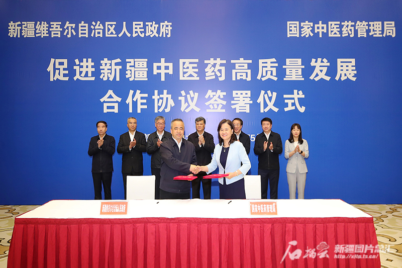 5月15日,自治区人民政府与国家中医药管理局签署促进新疆中医药高质量发展合作协议。石榴云/新疆日报记者 崔志坚摄
