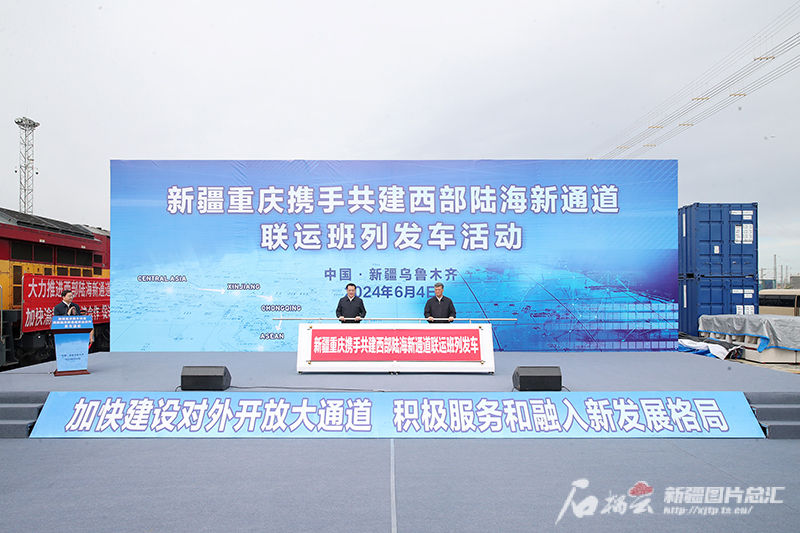 6月4日,重庆市委书记袁家军,自治区党委书记、兵团党委第一书记、第一政委马兴瑞共同为新疆重庆携手共建西部陆海新通道联运班列启动发车。石榴云/新疆日报记者 崔志坚摄