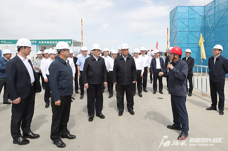 6月3日,重庆市委书记袁家军,自治区党委书记、兵团党委第一书记、第一政委马兴瑞在“疆电外送” 第三通道项目起点巴里坤哈萨克自治县,实地调研哈密北换流站工程进展及配套电源建设工作。石榴云/新疆日报记者 崔志坚摄