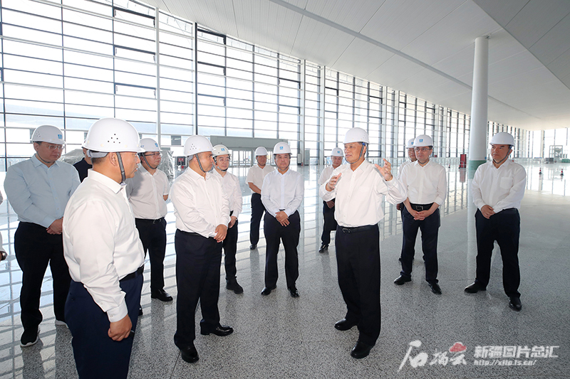 6月15日,自治区党委书记马兴瑞、自治区主席艾尔肯·吐尼亚孜等在乌鲁木齐机场T4航站楼听取机场改扩建工程规划建设工作汇报,向有关方面负责同志详细了解各项工作进展。石榴云/新疆日报记者 崔志坚摄