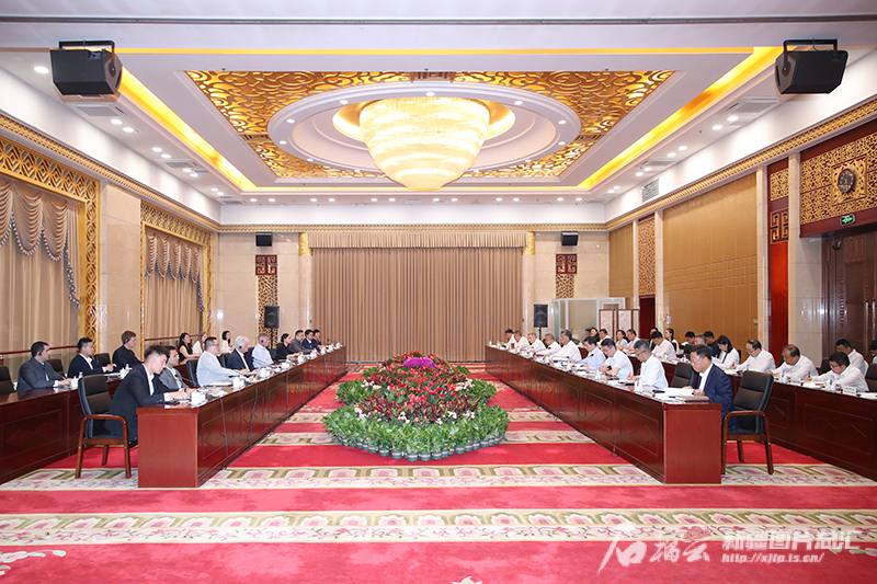 6月24日,自治区党委书记马兴瑞、自治区主席艾尔肯·吐尼亚孜在乌鲁木齐会见来新疆出席第八届中国—亚欧博览会的联合国前副秘书长、欧盟—亚洲中心主席埃里克·索尔海姆一行。 石榴云/新疆日报记者 崔志坚摄