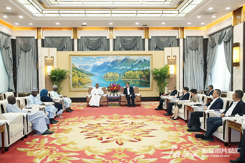 7月3日,自治区党委书记马兴瑞、自治区主席艾尔肯·吐尼亚孜在乌鲁木齐会见来新疆访问的乍得爱国拯救运动总书记巴达及所率代表团一行。石榴云/新疆日报记者 崔志坚摄