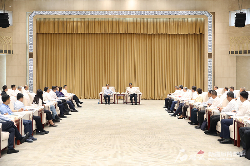 8月13日,自治区党委书记马兴瑞、自治区主席艾尔肯·吐尼亚孜在乌鲁木齐会见来疆考察交流的“北京网络企业红色故土新疆行”代表团一行。石榴云/新疆日报记者 崔志坚摄