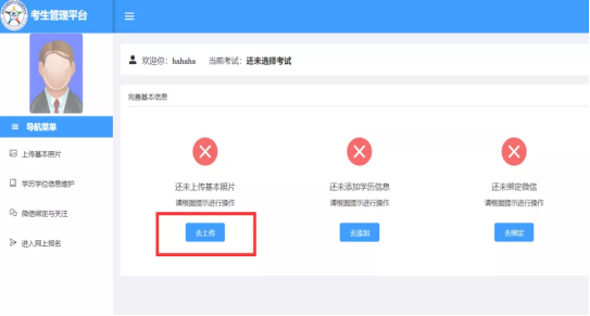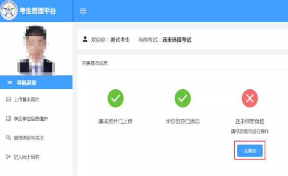 注册完成登录网上报名系统后,按照页面提示进行上传基本照片、维护学历学位信息和绑定微信操作。