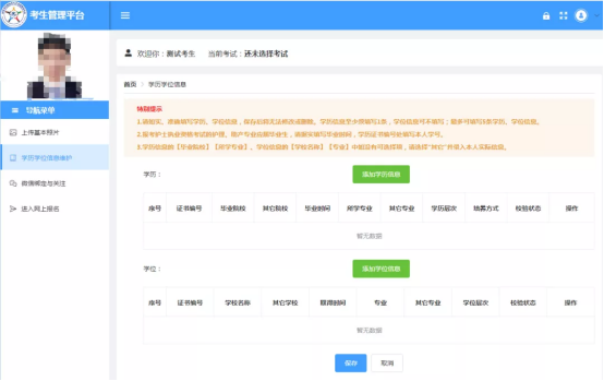 2、根据系统提示,添加学历或学位信息,添加完成后,点击【保存】按钮,完成学历或学位信息的维护。