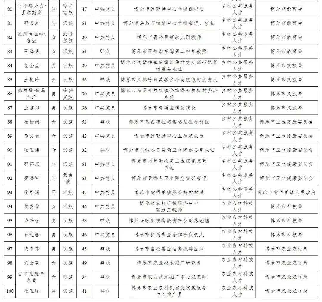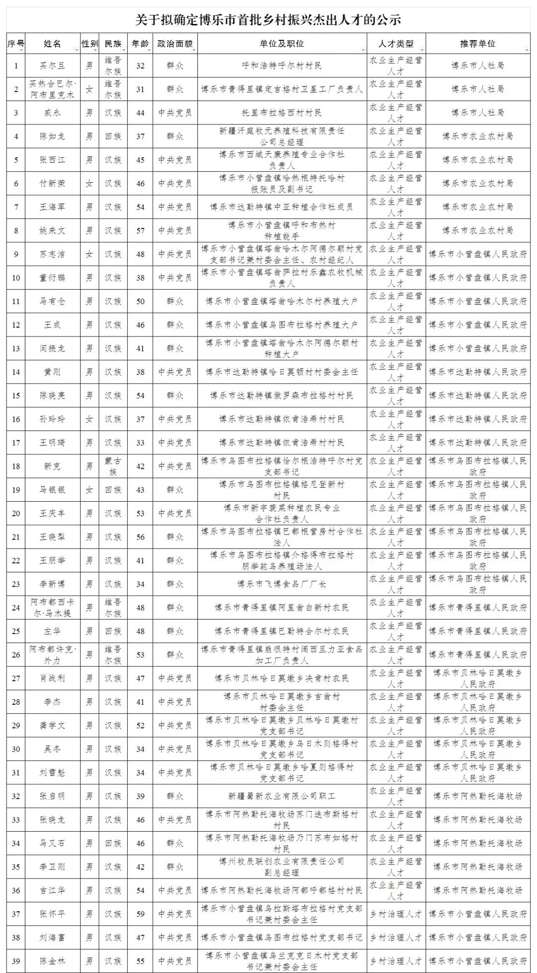 为贯彻落实习近平总书记关于乡村振兴工作重要指示批示精神,充分发挥人才在乡村振兴中的“动力源”作用,展示博乐市乡村振兴一线奋斗者良好精神风貌,示范引领全市广大党员干部、优秀企业家、农技工作者积极投身乡村建设,助力乡村振兴。经研究决定,面向全市农业生产一线和农村经济社会发展中直接从事生产、经营、服务等活动,具有较强的创新创业能力或一技之长的乡村工作者、乡村能人,推荐命名一批博乐市乡村振兴杰出人才。经各单位推荐和专家评审,拟命名陈如龙等100人为博乐市首批乡村振兴杰出人才,现予以公示,公示时间为2021年12月7日至12月13日。