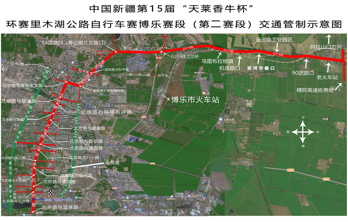 G219线老火车站十字路口-飞机场-乌图布拉格镇-G219线立交桥-团结路零公里路口-青得里大街-北京路-两体一中心-温泉路。详情请看交通管制示意图。
