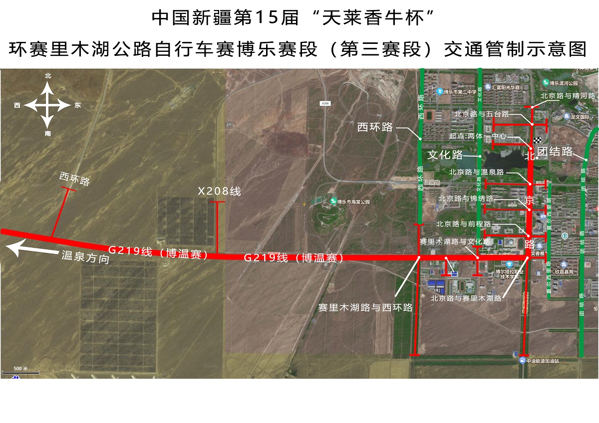 2023年6月11日至13日,中国新疆第十五届“天莱香牛杯”环赛里木湖公路自行车赛将在博乐市辖区举行。为确保赛事顺利进行,博乐市公安局交通管理大队将对博乐市三条赛段道路实行分段临时交通管制,现将有关事项通告如下: