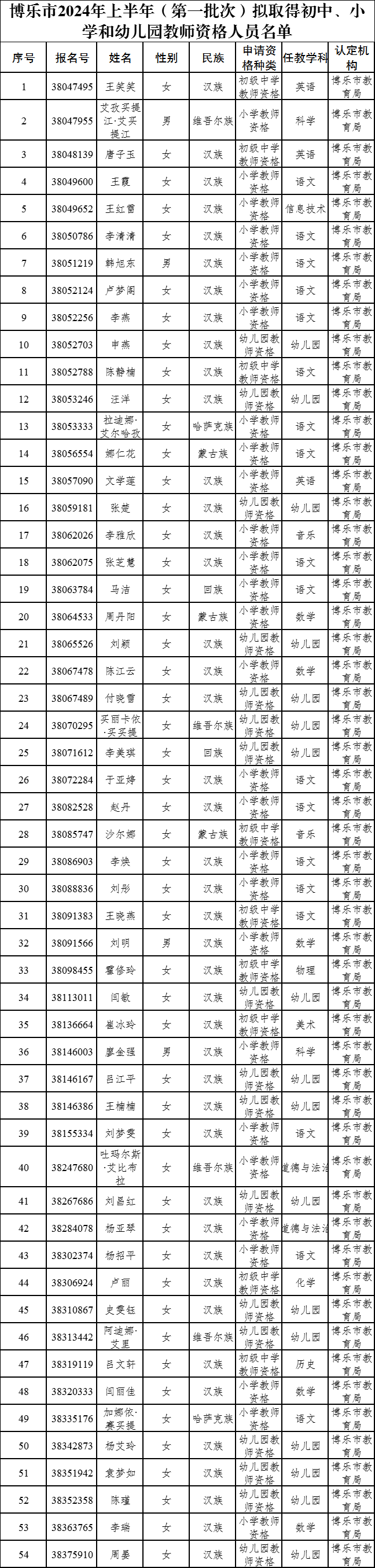 根据《中华人民共和国教师法》《教师资格条例》《<教师资格条例>实施办法》《新疆维吾尔自治区2024年上半年中小学和幼儿园教师资格认定公告》和《博乐市2024年上半年中小学和幼儿园教师资格认定公告》有关要求,按照法定条件、标准,经过网上报名、现场确认、体检等程序,54名在博乐市教育局申请初中、小学、幼儿园教师资格证人员符合相应的教师资格认定条件,拟取得相应教师资格。现将有关人员名单予以公示,公示期自2024年5月10日至5月15日(5个工作日)。如有异议,请在公示期内向博乐市教育局组织人事办公室反映,并提供书面材料。联系电话:0909-2285575。