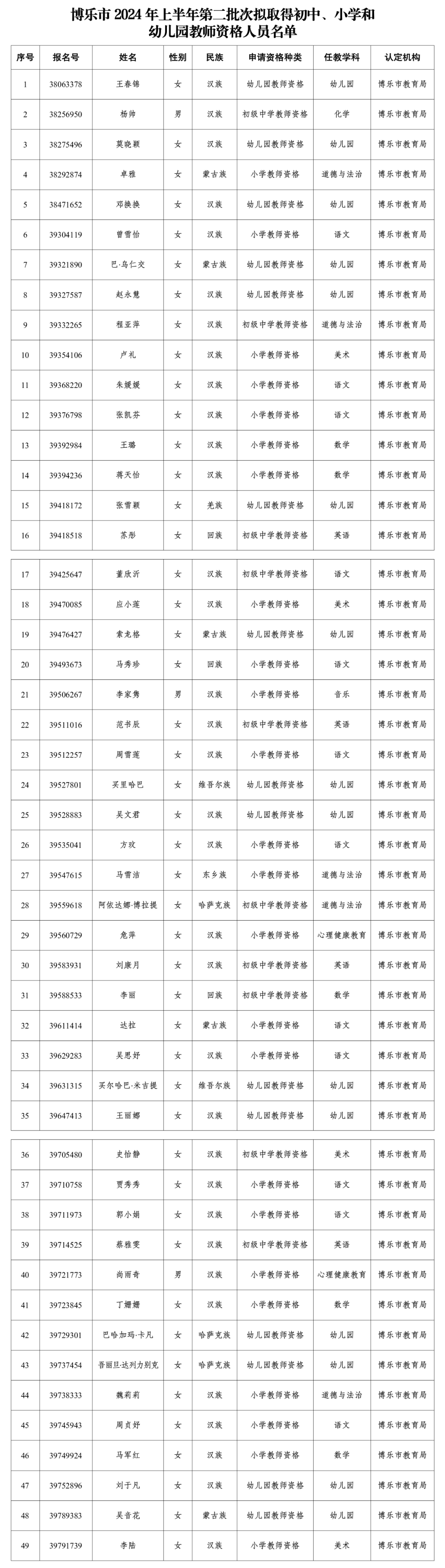 根据《中华人民共和国教师法》《教师资格条例》《<教师资格条例>实施办法》《新疆维吾尔自治区2024年上半年中小学和幼儿园教师资格认定公告》和《博乐市2024年上半年第二批次中小学和幼儿园教师资格认定公告》有关要求,按照法定条件、标准,经过网上报名、现场确认、体检、政审等程序,49名在博乐市教育局申请初中、小学、幼儿园教师资格证人员符合相应的教师资格认定条件,拟取得相应教师资格。现将有关人员名单予以公示,公示期自2024年7月17日至7月23日(5个工作日)。如有异议,请在公示期内向博乐市教育局组织人事办公室反映,并提供书面材料。联系电话:0909-2285575。
