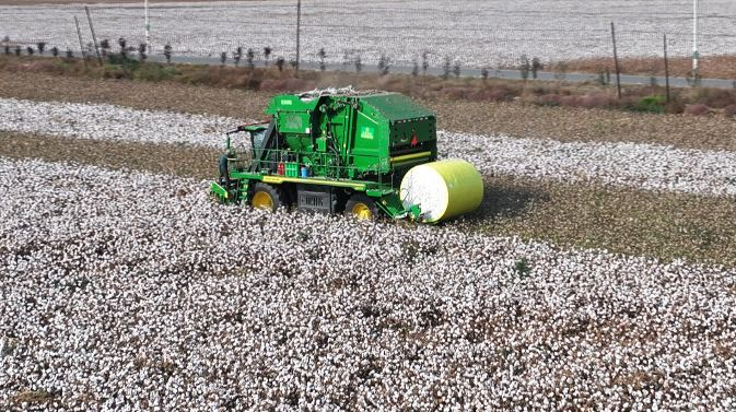 在一处棉田边,一台完成检修的采棉机正试运转。机械臂缓缓伸展,采头贴近模拟棉株,摘锭飞速转动,流畅的“采收动作”让一旁的棉农倍感踏实。