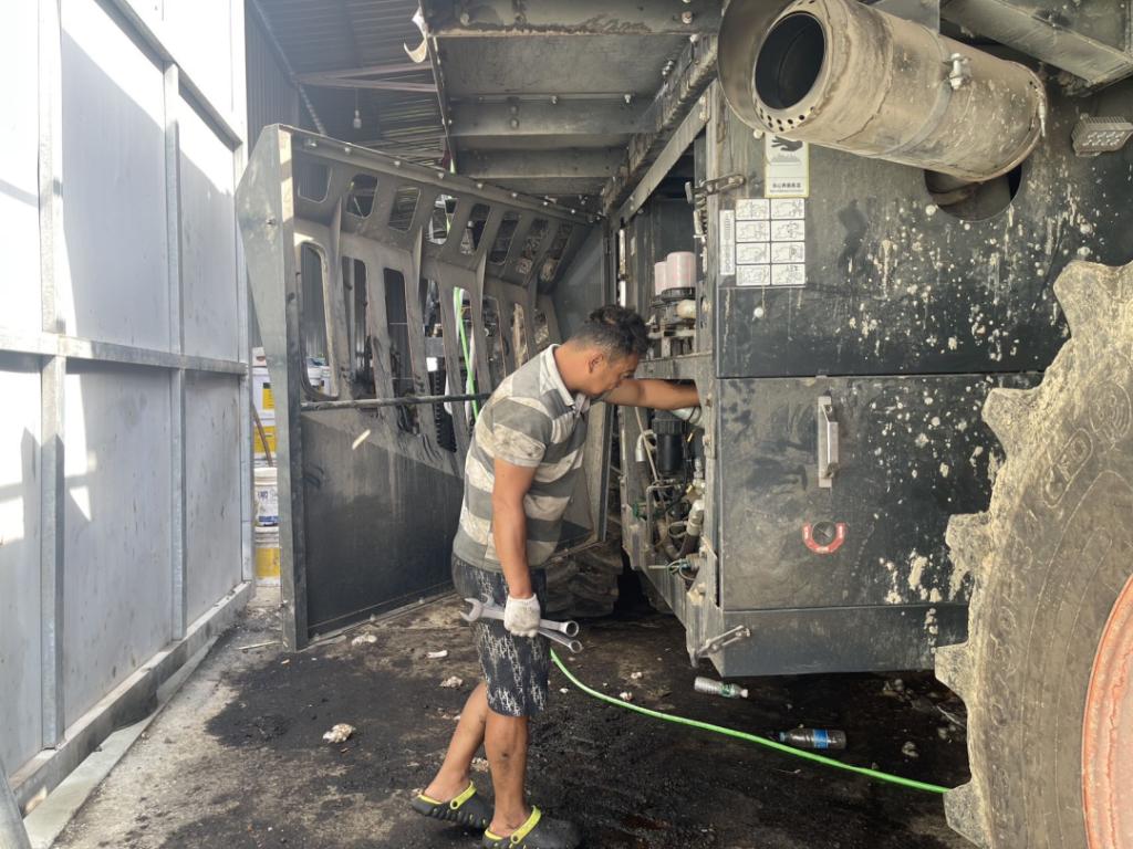 在达勒特镇一处农机维修场地,多台采棉机正“列队”接受“体检”。维修师傅们手持工具穿梭其间,拆卸、检查、更换零件的动作娴熟利落。有的俯身查看底盘,排查轴承磨损;有的专注于采头部件,逐一更换老化的摘锭和脱棉盘——这些直接接触棉花的零件,是检修的重中之重。维修车间里此起彼伏的工具碰撞声,成了秋收前最务实的“筹备曲”。