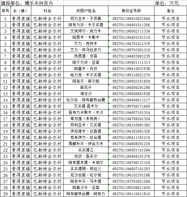 博乐市2019年度财政专项扶贫资金(扶贫发展)项目计划到户名单-巴勒特合尔村