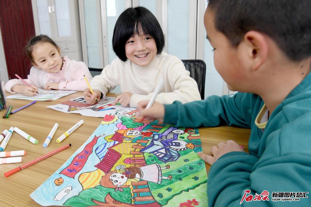 12月20日,博尔塔拉蒙古自治州博乐市乌图布拉格镇格尼登新村的孩子们用画笔描绘自己眼中的村貌。