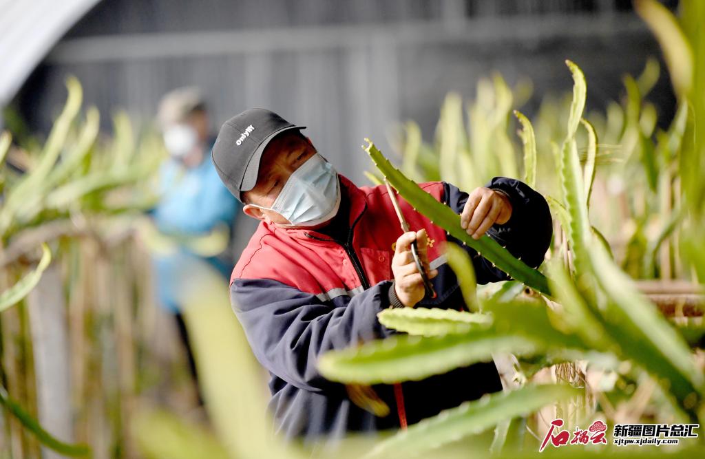 12月21日,博尔塔拉蒙古自治州博乐市乌图布拉格镇格尼登新村村民在特色种植基地管护火龙果。
