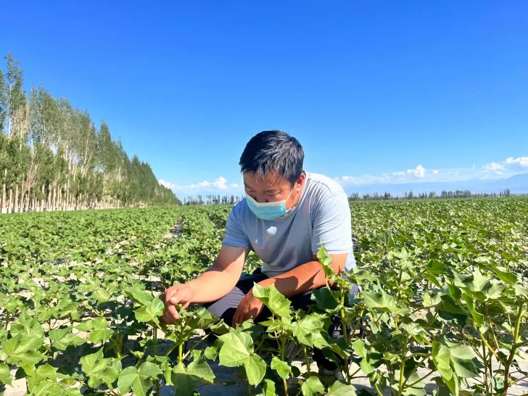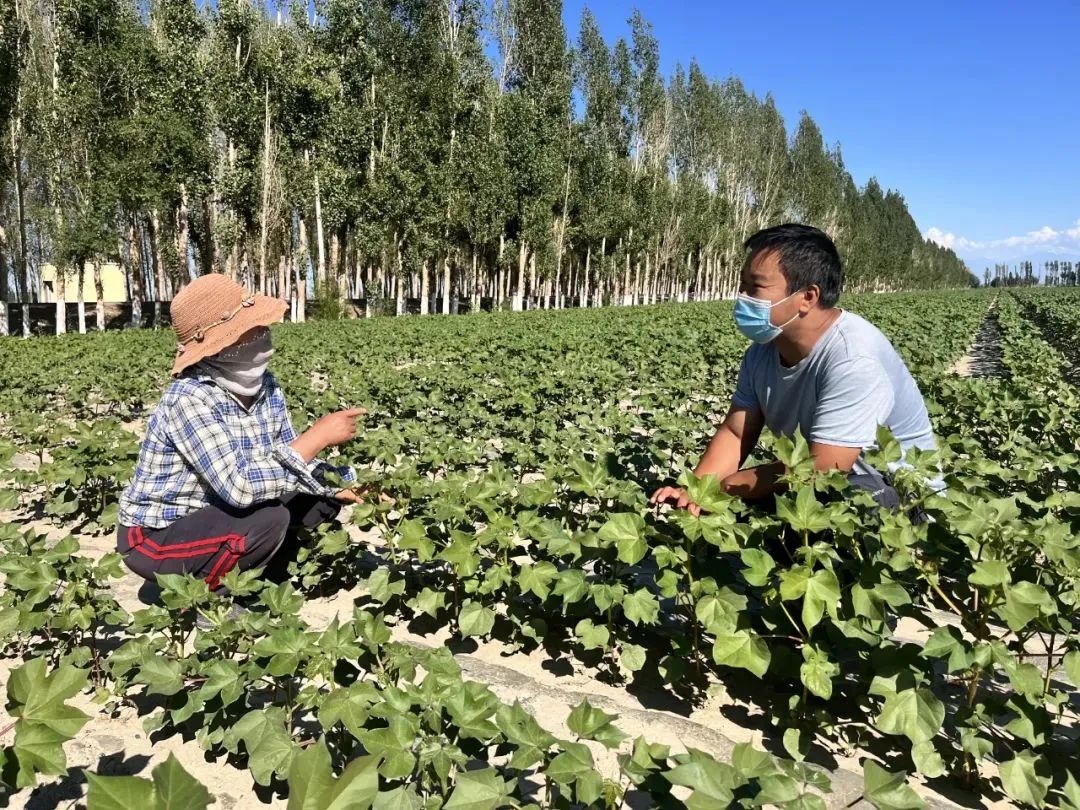 “智慧灌溉就是通过手机APP和遥感技术对农业棉花全过程进行实施监控。”博乐市达勒特镇都图敖博村党支部书记青松正在与棉农交谈科学种田。