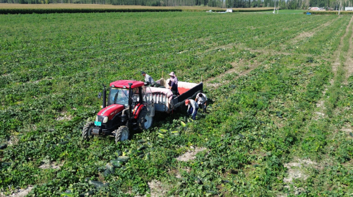 眼下正值冬瓜成熟的季节,博乐市小营盘镇当合尔特布拉格村今年种植了300多亩冬瓜,在入村道路沿线、田间地头,瓜农们忙着采摘、搬运、装车呈现出一派丰收忙碌的景象。