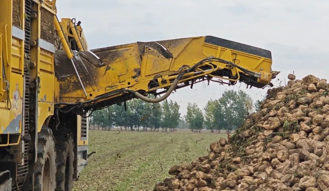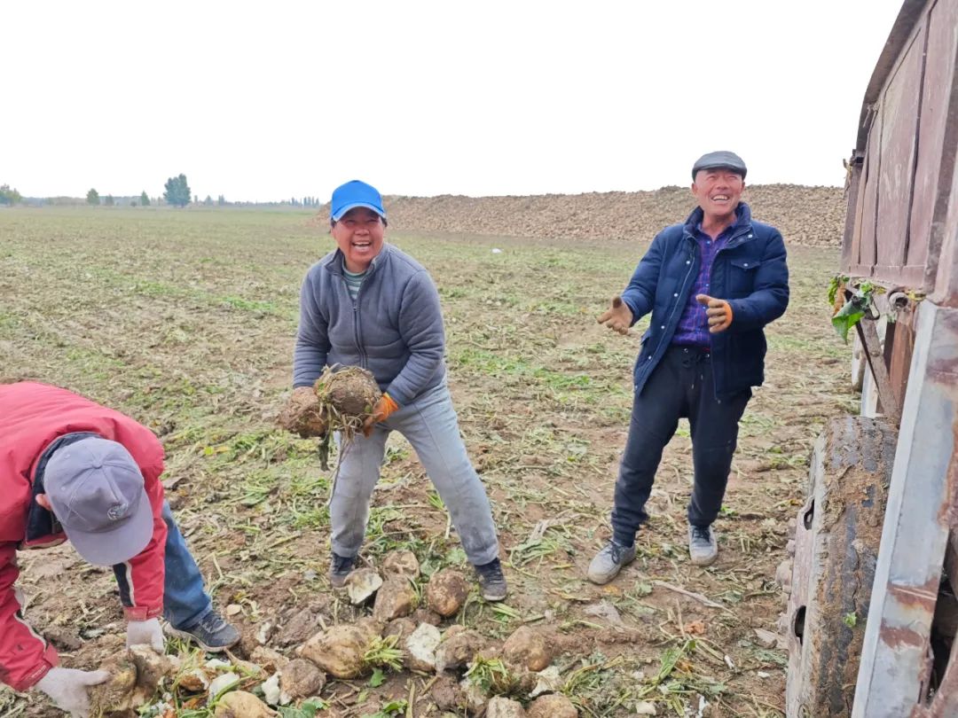 记者在该镇哈日莫墩村种植户鲁松明的甜菜地里看到,大型收割机正在田间来回穿梭,一个个甜菜经过装载机多重除杂后传送至运输车内,现场一片繁忙景象。