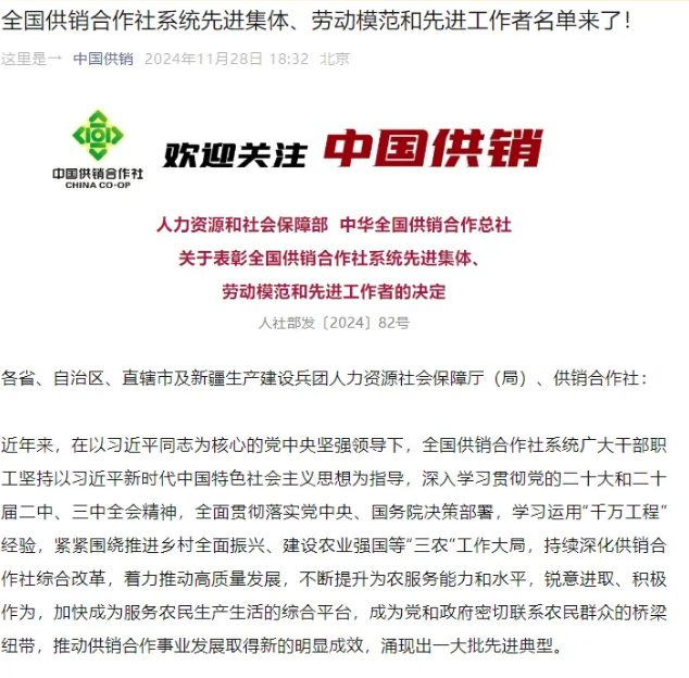 11月26日,人力资源和社会保障部,中华全国供销合作总社对全国供销合作社系统先进集体劳动模范和先进工作者进行了表彰,其中博乐市达勒特镇供销合作社光荣上榜啦。