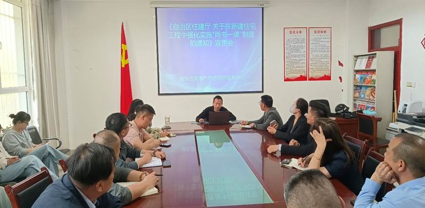 为深入贯彻落实自治区住房和城乡建设厅《关于在新建住宅工程中强化实施“两书一牌”制度的通知》(新建规〔2025〕5号)要求,加快构建房地产发展新模式,进一步提升住宅工程质量,切实为人民群众提供安全、舒适、绿色、智慧的“好房子”,进一步压实建设单位首要责任及参建各方质量主体责任,增强人民群众获得感、幸福感、安全感。4月23日,市房产服务中心组织召开专题学习会,全市16家房地产开发企业参加学习。
