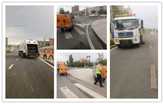 加大城区主次干道冲洗和喷雾抑尘,做好道路扬尘和空气治理工作,每日调派4辆洒水抑尘车,对道路进行不间断清扫、洒水降尘,做到人停车不停,确保市区路面尘土不上扬,提高空气质量。8辆清扫机械每天早上7:00时开始上路工作至晚上21:00时,共14个小时进行路段清扫保洁作业制度。车辆作业时,须无扬尘,作业后的路面、中心边线、路牙无污水、浮土和各种废弃物。每日出动15辆多功能环卫小型电动洗扫车对道路两旁的路沿石、栏杆、垃圾分类果皮箱、垃圾箱(桶)、斑马线油污、电线杆等公共设施进行冲洗。