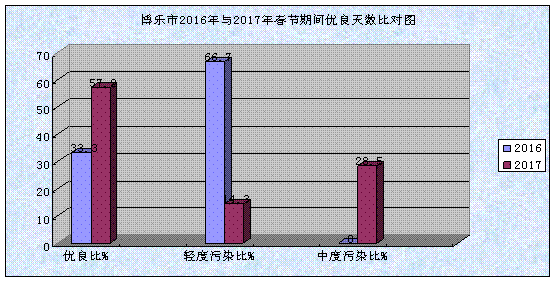 按照《环境空气质量标准》(GB3095-2012)评价,2017年春节期间(1月27日至2月2日),博乐市空气质量达标天数比例33.3%、于2016年春节期间相比优良率下降了23.9%。2017年春节期间良2天,轻度污染4天(1天无效数据)、未出现中度、重度、严重污染天数。2016年春节期间优3天、良1天,轻度污染1天、中度污染2天、未出现重度、严重污染天数。