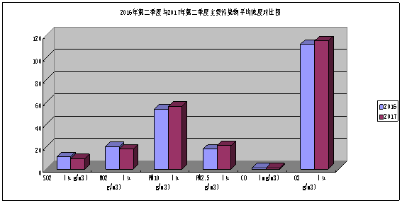 按照《环境空气质量标准》(GB3095-2012)评价,2017年第二季度(4月1日至6月30日),博乐市空气质量达标天数比例98.9%(优天数14天、良天数76天),轻度污染天数比例为1.1%(轻度污染天数1天),未出现重度污染和严重污染。在所有监测日中,首要污染物为O3日最大8小时、PM10。