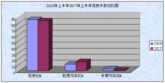 按照《环境空气质量标准》(GB3095-2012)评价,2017年上半年(1月1日至6月30日、有效天数共180天),博乐市空气质量达标天数比例83.9%(优天数18天、良天数133天),与去年同期相比下降了1.8%,轻度污染天数比例为15%(轻度污染天数27天),与去年同期相比上升了4%,中度污染天数比例为1.1%(中度污染天数2天),与去年同期相比下降了2.2%,未出现重度污染和严重污染。在所有监测日中,首要污染物为PM10、PM2.5、O3日最大8小时值。