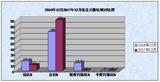按照《环境空气质量标准》(GB3095-2012)评价,2017年12月(有效发布数据有30期、无效数据1期)、博乐市空气质量优天数为3天,占比例10.0%;良天数为27天,占比例90.0%;未出现轻度污染、中度污染、重度污染和严重污染。在所有监测日中,首要污染物PM2.5占73.3%、PM10占16.7%。