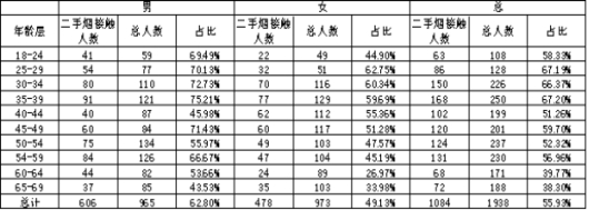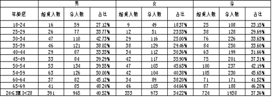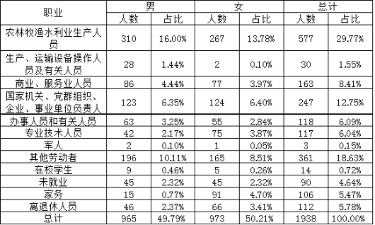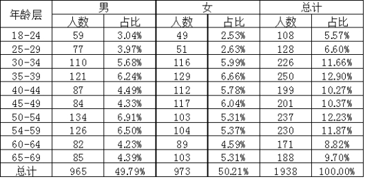 本次抽样调查人群1938人,男性965人,占49.79%,女性973人,占50.21%,男女性别比为0.992:1(表2)。