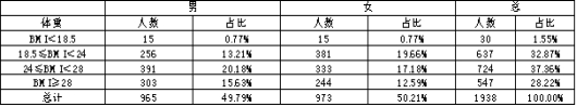 ⑴体质指数分布情况。按照超重、肥胖的定义,将体质指数(BMI)在24~27.9之间,定义为超重,大于等于28,定义为肥胖,而体质指数在18.5以下,视为体重偏轻,18.5~23.9之间为体重正常。博乐市18岁以上人群,体重正常的比例为32.87%,超重者占37.36%,肥胖者占28.22%(表14)。