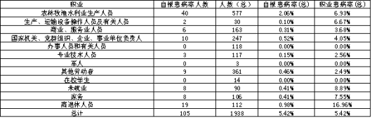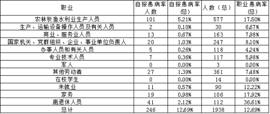 本次调查人群中农民占总调查人数的比例最大,为29.77%,其次为其他劳动者和机关,企事业单位人员,分别为18.63%和12.75%,其他占比均小于10%(表4)。