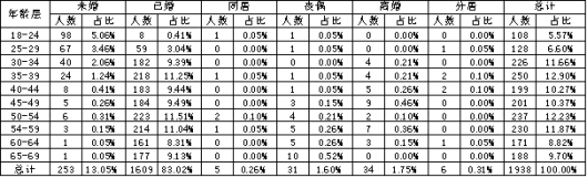 本次调查人群中未婚占13.04%,已婚占83.03%,同居占0.25%、丧偶占1.58%、离婚占1.78%,分居占0.25%。(表5)