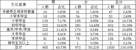 其中未接受正规教育的占2.43%,小学毕业的占16.72%,小学未毕业的占2.68%,初中毕业占31.06%,高中(中专、技校)为:20.85%,大专为18.11%,本科占8.05%,研究生及以上学历的为0.10%(表3)。
