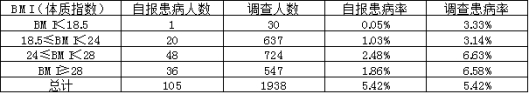 博乐市18岁及以上成年人群糖尿病患病率为5.42%,随着年龄增大,年龄组人群的糖尿病患病率依次升高,50岁以后患病率明显上升,男女性糖尿病患病率无显著差异;随BMI指数增大,其糖尿病患病率呈上升趋势(表11~13)