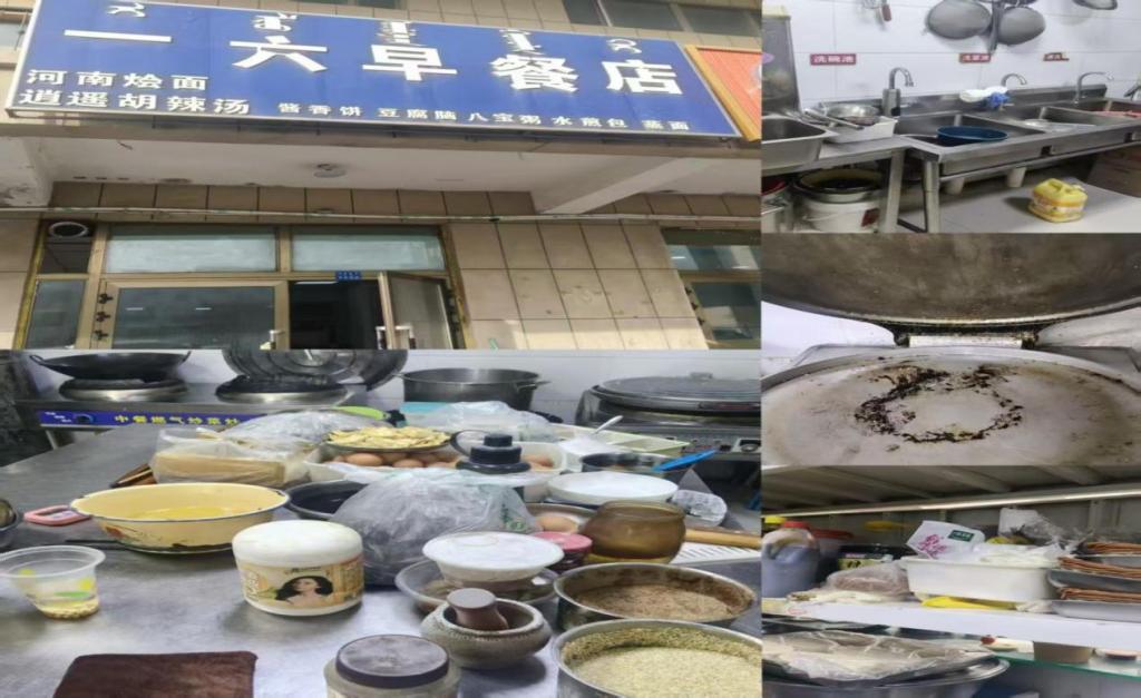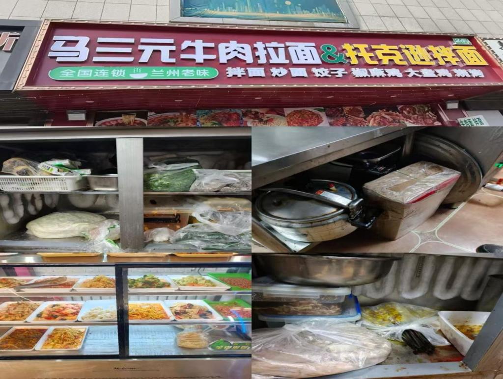 曝光理由:1.后堂卫生脏乱,存在卫生死角、杂物堆积问题;2.后堂未配备脚踏式垃圾桶,外包装、清洁工具违规进入后堂,易造成交叉污染;3.和面机和压面机表面残留污渍,未及时清洁;4.待加工食材、调味料等未覆膜防护,存在污染风险。
