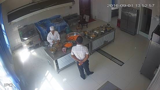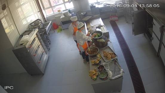 博乐市第九中学后堂,2016年9月1日上午,视频监控平台拍摄,卫生状况:地面、墙壁、灶具、水池洁净,食材新鲜, 2名工作人员穿戴清洁的工作衣帽上岗。