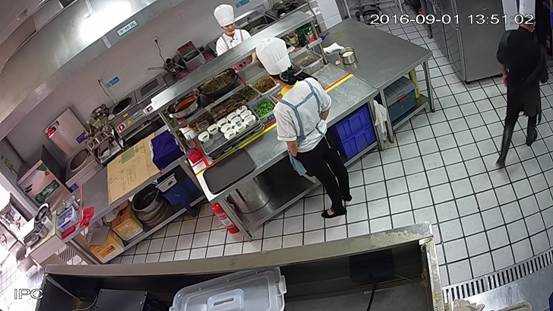 博乐市顺水鱼馆厨房,2016年9月1日上午,视频监控平台拍摄,墙面、地面、设施、设备洁净,物品摆放整齐。 3名工作人员在后堂上岗,其中1名工作人员未穿清洁的工作衣上岗。