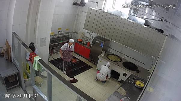博乐市馨予幼儿园后堂,2016年9月27日下午,视频监控平台拍摄,卫生状况:地面、墙壁、灶具、水池洁净,标识清楚。2名工作人穿戴干净工作衣帽上岗。