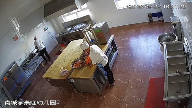 博乐市南城宇泰隆幼儿园后堂,2016年9月27日上午,视频监控平台拍摄,墙面、地面洁净,厨具、设施、设备洁净,标注标识清楚。2名工作人员穿戴干净的工作衣帽上岗。