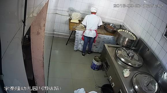 博乐市宇泰隆幼儿园(团结路)后堂,2016年9月27日下午,视频监控平台拍摄,墙面、地面、厨具、用具洁净,物品摆放整齐。1名工作人员穿戴干净的工作衣帽上岗。