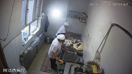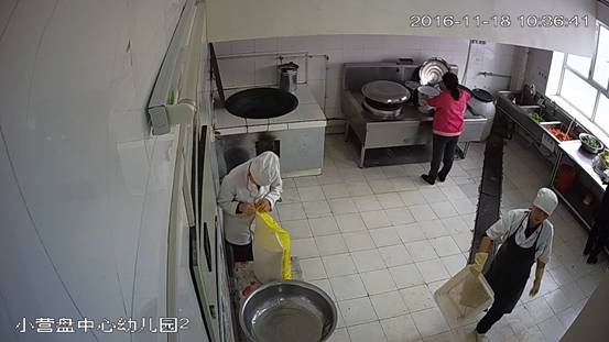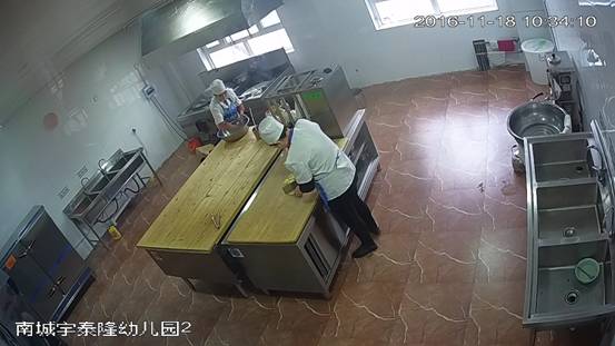 博乐市南城宇泰隆幼儿园后堂,2016年11月18日上午,视频监控平台拍摄,墙面、地面、厨具、用具洁净,物品摆放整齐,2名工作人员穿戴整洁的工作衣帽上岗 。