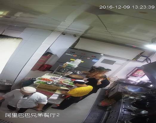 博乐市阿里巴巴兄弟餐厅,2016年12月9日上午,视频监控平台拍摄,卫生状况:墙面、地面、炊具、用具表面洁净,设施、设备齐全,食材新鲜,2名工作人员未穿戴清洁的工作衣帽帽上岗。