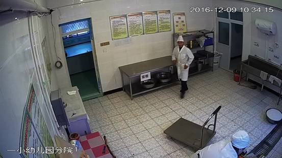 博乐市一小幼儿园分院后堂,2016年12月9日上午,视频监控平台拍摄,墙面、地面洁净,厨具、用具洁净。设备均为不锈钢材质,2名工作人员穿戴清洁的工作衣帽上岗。