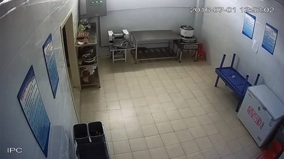 博乐市锦绣农贸市场范特西幼儿园,2016年7月1日上午,视频监控平台拍摄,墙面、地面无污渍,炊具、用具洁净。物品摆放整齐。