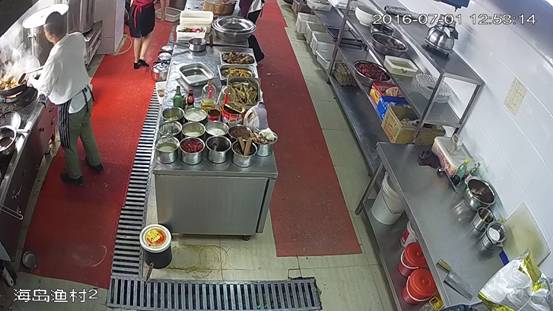 博乐市海岛渔村后堂,2016年7月1日上午,视频监控平台拍摄,墙面洁净、地面有污渍,厨具、用具干净但摆放凌乱。1名工作人员穿清洁工作衣、未戴帽上岗。